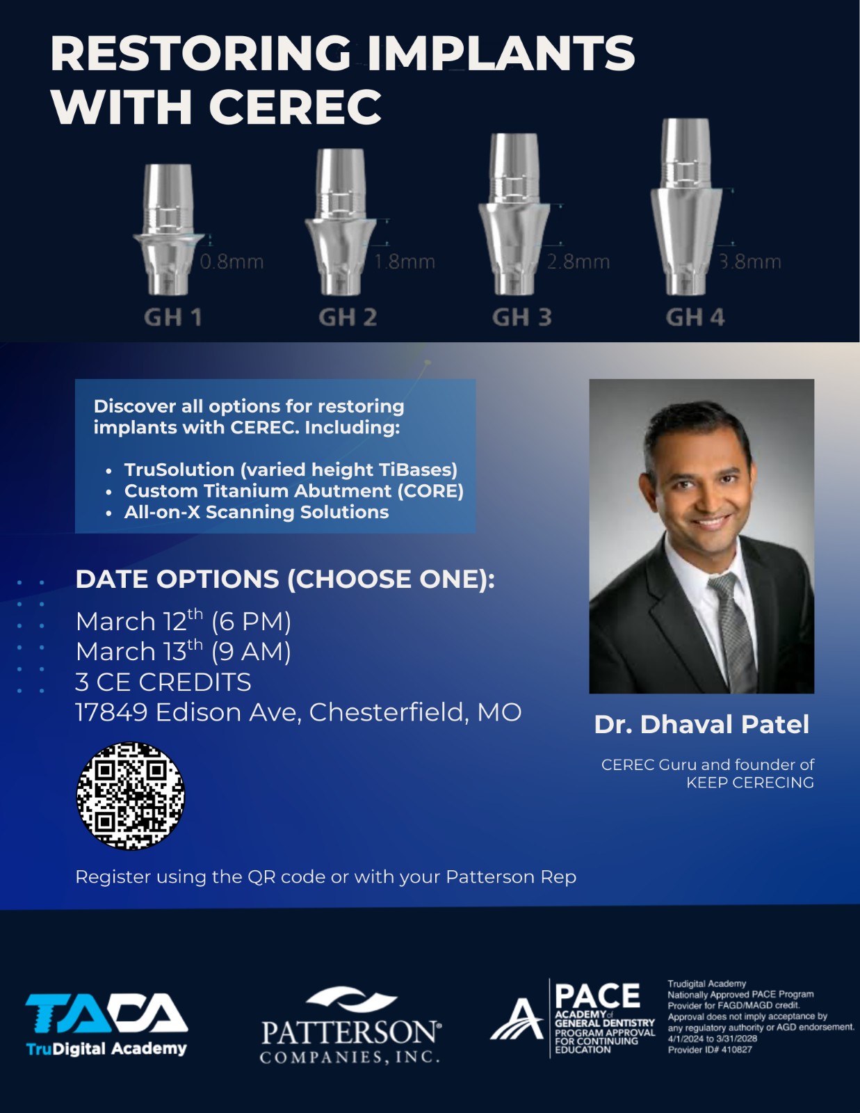 During this educational session, Dr. Dhaval Patel will walk attendees through the full range of implant restoration options available with CEREC. Topics will include the use of TruAbutment’s varied-length Ti-bases (designed to reduce tissue and bone compression), their CORE file workflow (where a titanium abutment is milled by them/shipped to you and a crown file is provided for in-house milling), and additional fully in-office fabrication options.